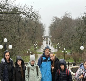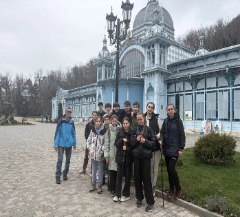 30 марта в 8-00 группа собралась на автовокзале города Георгиевска. Вначале мы доехали до города Пятигорска. Там пересели на другую маршрутку и добрались до города Железноводска. Отсюда началось пешее путешествие. Мы вначале осмотрели центр города, мемориал, посвященный Великой Отечественной войне, а затем пошли в курортный парк. Там ребята познакомились с его достопримечательностями. От центральной площади парка за Лермонтовской галереей начался подъем по тропе на вершину горы Железной. Погода испортилась, пошел дождь, но мы настойчиво продвигались в верх. Спустя час мы оказались на вершине горы. По пути группа выходила на смотровые площадки откуда открывался красивый вид на горы Развалка, Змейка, Бештау и Медовая.